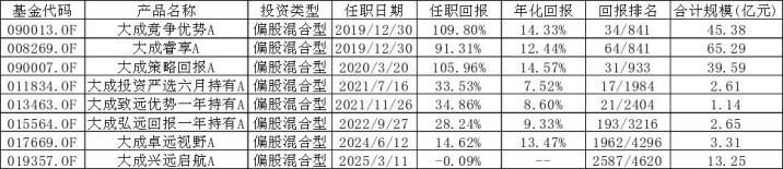 或是与大成基金的缘分深厚,2019年徐彦再次回到老东家,先后担任股票投资部总监、首席权益投资官,其创造投资回报不减当年。截至日前,徐彦在大成基金共管理8只公募产品,总规模达173.21亿元。